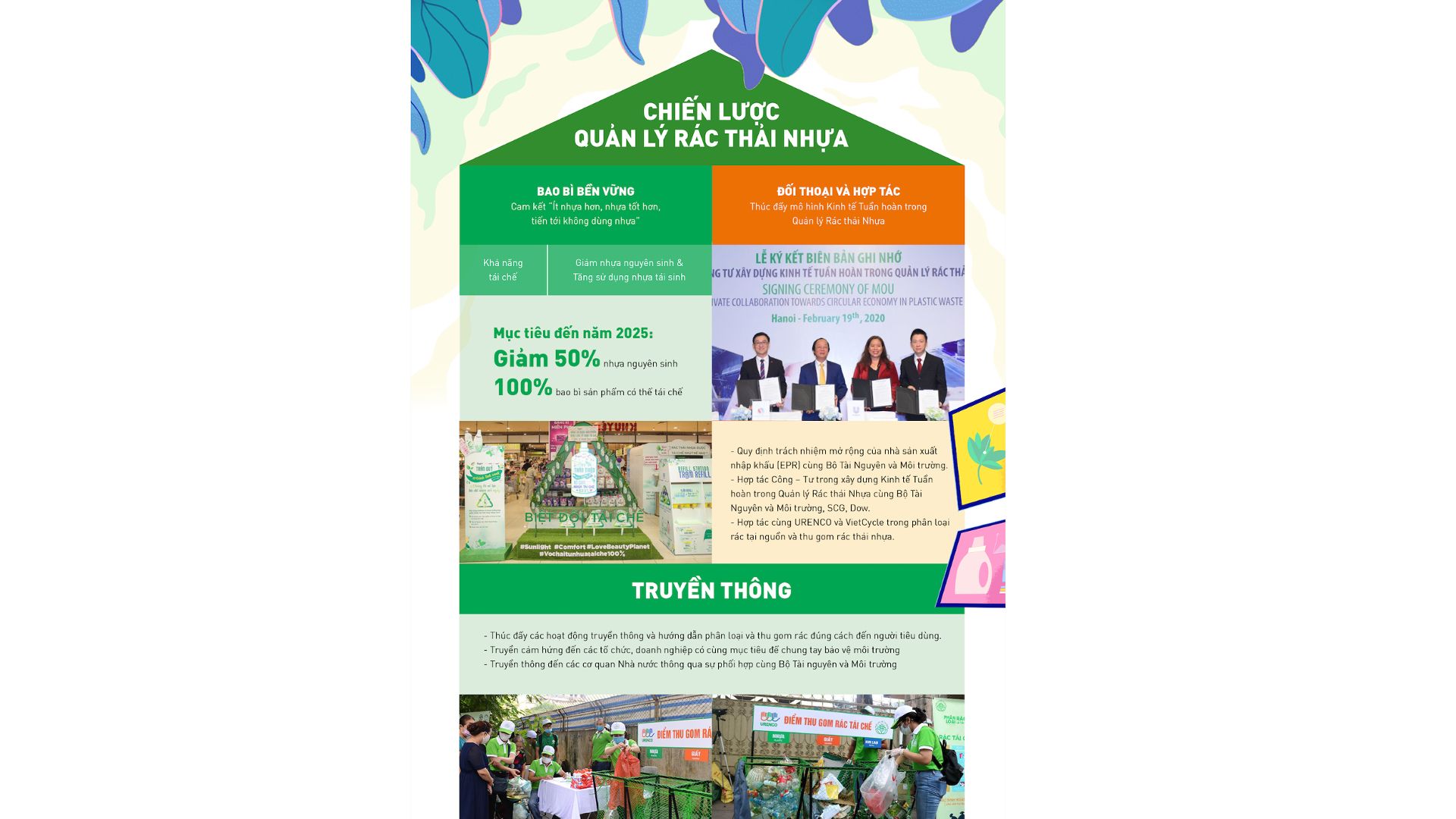 Tại Unilever Việt Nam, chúng tôi thúc đẩy cải thiện sức khỏe hành tinh thông qua các hoạt động sản xuất bền vững, trồng cây, và điển hình là chiến lược quản lý rác thải nhựa.
