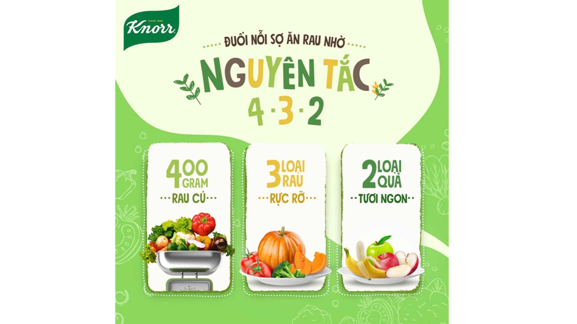 Cuối năm 2021, trên cơ sở thấu hiểu những trở ngại trong hành trình hình thành thói quen dinh dưỡng tích cực, lành mạnh cho cả gia đình, đặc biệt là trẻ em, Knorr đã hợp tác cùng Viện Dinh dưỡng quốc gia triển khai chiến dịch “Cơm nhà đủ rau, nuôi tương lai muôn màu” với thông điệp trọng tâm là “Nguyên tắc 4 - 3 - 2” để mang đến giải pháp giúp người tiêu dùng tìm ra cách thức chủ động bổ sung rau củ quả vào bữa ăn hàng ngày.