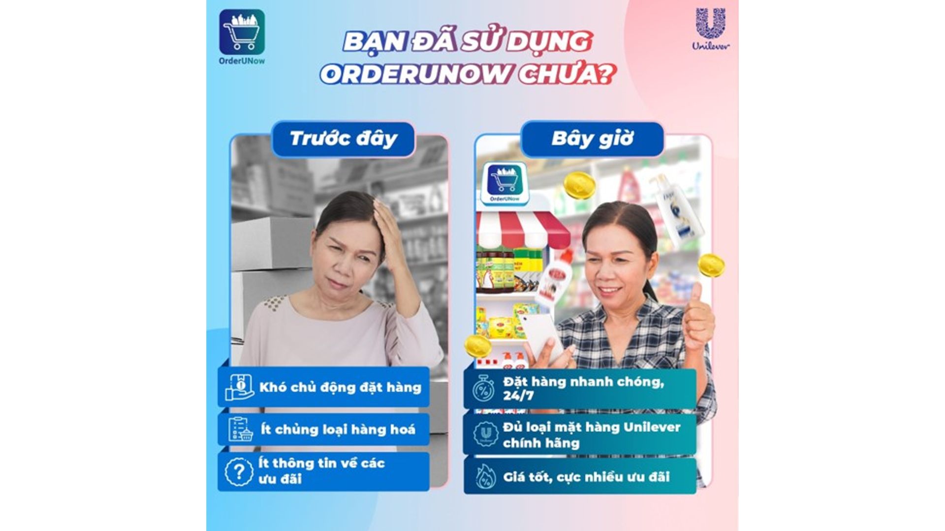 Thông qua cài đặt và sử dụng ứng dụng OrderUNow trên di động, các tiểu thương có thể nhập hàng chính hãng từ Unilever 24/7 với giá tốt, đa dạng mặt hàng và nhiều ưu đãi độc quyền, đặc biệt giao hàng miễn phí 24h, cũng như đảm bảo nguồn hàng ổn định và an toàn mùa dịch.