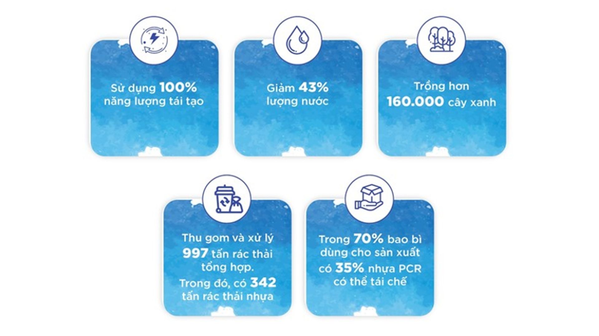 Hoạt động sản xuất, kinh doanh của công ty đã chuyển sang sử dụng 100% năng lượng tái tạo và giảm 43% lượng nước. Toàn bộ hệ thống nhà máy Unilever tại Việt Nam không có rác thải độc hại phải chôn lấp và đã trung hòa được lượng carbon phát sinh.