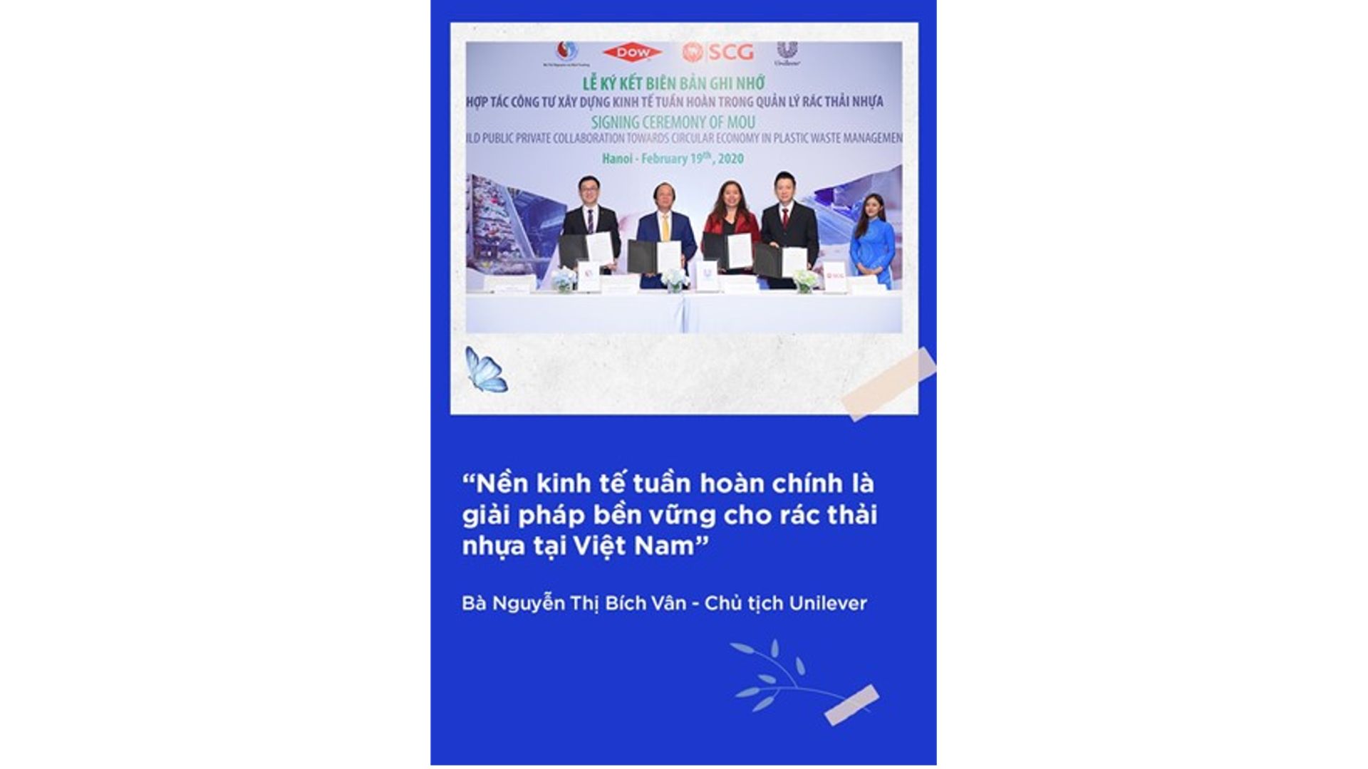 Chia sẻ về thỏa thuận hợp tác này, bà Nguyễn Thị Bích Vân - Chủ tịch Unilever - nhấn mạnh khát vọng xây dựng nền kinh tế tuần hoàn cho rác thải nhựa tại Việt Nam: “Đây là lần đầu tiên chúng ta thiết lập được một nhóm làm việc tâm huyết để triển khai mô hình thu gom, tái chế rác thải nhựa một cách thực tế và hiệu quả. Sự đồng thuận của Bộ Tài nguyên và Môi trường cùng các đối tác một lần nữa khẳng định hướng tiếp cận đúng đắn của Unilever: Nền kinh tế tuần hoàn chính là giải pháp bền vững cho rác thải nhựa tại Việt Nam!”